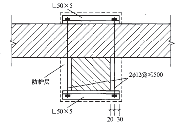 11.2.1 新增設(shè)扶壁柱的截面寬度不應(yīng)小于2ωrnrn,其厚度不應(yīng)小120mm (圖11.2. 1)。當(dāng)用角鋼-螺栓拉結(jié)時,應(yīng)沿墻的全高和內(nèi)外的周邊,增設(shè)水泥砂漿或細(xì)石混凝土防護層(圖1 1. 2. 3) 。