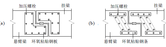 在懸臂梁牛腿處或掛梁端部粘貼鋼板可增強(qiáng)構(gòu)件的抗剪強(qiáng)度( 支座、牛腿處出現(xiàn)裂縫時(shí)),鋼板通常為塊狀(圖7-3-3a)或帶狀(7-3-3b )。帶狀鋼板設(shè)置方向一般與主拉應(yīng)力方向平行( 即與剪切裂縫方向垂直), 跨縫布置上下端設(shè)水平錨固板, 以提高端部的錨固強(qiáng)度,鋼板厚度一般為10~ 15mm。