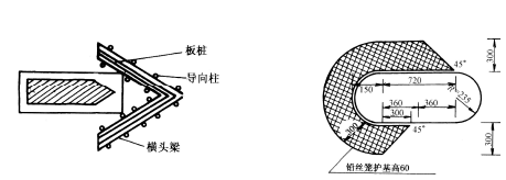 ( 6)板樁墩頭防護(hù)。對(duì)于土質(zhì)和砂礫石的變遷性河段,可采用板樁進(jìn)行墩頭防護(hù),見圖10-3-4。板樁頂面一般不應(yīng)高出河床面,最好埋置在沖刷線以下,因板柱高出床面,會(huì)產(chǎn)生阻水,在板樁前造成局部沖刷,影響護(hù)樁安全。板樁尖頭做成單向斜口式,打樁時(shí)可使板樁接縫緊密,板樁入土嵌制深度一般為0.5~1.0m。