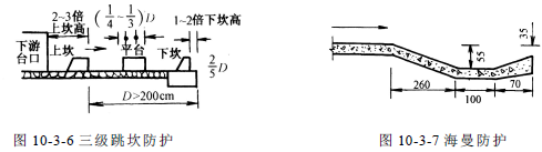 ( 10) 三級(jí)跳坎防護(hù)。當(dāng)下游沖刷嚴(yán)重,為緩沖水流沖刷影響,可用漿砌塊、片石或預(yù)制混凝土塊筑成三級(jí)消力坎(或稱三級(jí)跳坎),見圖10-3-6。
