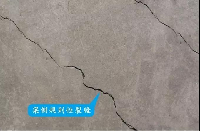 表現(xiàn)形式:現(xiàn)澆樓板上表面在梁兩側(cè)出現(xiàn)規(guī)則性裂縫。