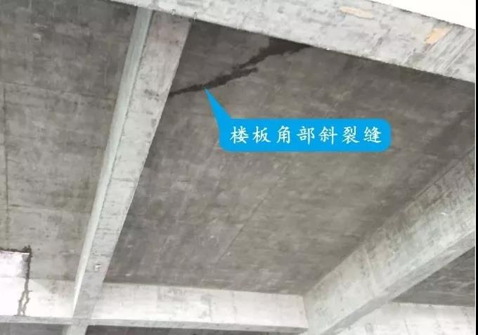 表現(xiàn)形式:現(xiàn)澆樓板角部產(chǎn)生斜裂縫。