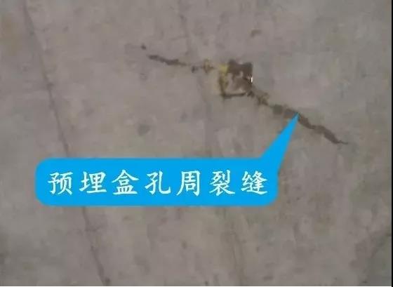 表現(xiàn)形式:施工預留孔洞和水電預埋盒沿孔洞四角產(chǎn)生延伸裂縫。