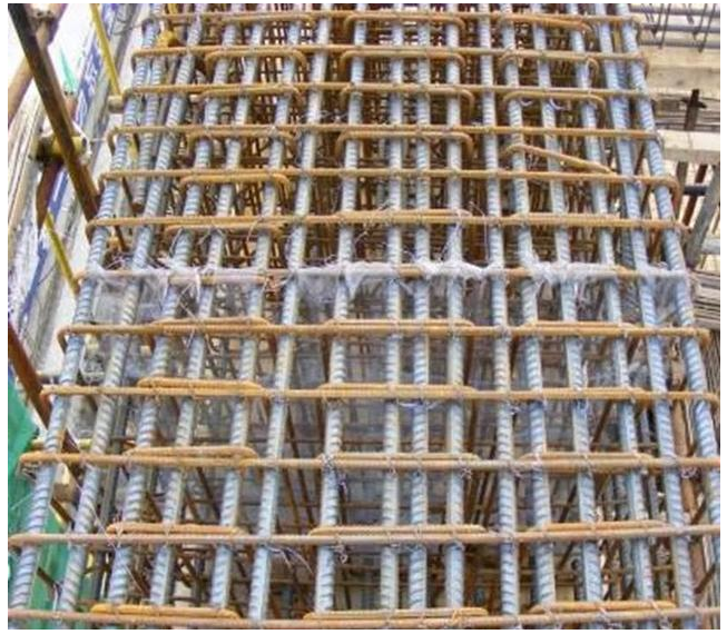 采用鋼板網(wǎng)(簡易收口網(wǎng))垂直欄設(shè)在節(jié)點(diǎn)處,距高強(qiáng)度等級混凝土的墻柱邊500mm處,高低不同強(qiáng)度等級混凝土同步澆筑。