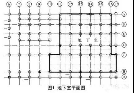 貴州巖溶地區(qū)某建筑物位于斜坡地帶,建筑物長93m,寬36m,地上3層,地下l層(-4.8m架空停車場(chǎng)),局部地下室,地下室長38.8m,寬36m,獨(dú)立柱基礎(chǔ),單柱最大荷重3800kN,地基持力層為中風(fēng)化泥質(zhì)白云巖,Ⅱ類建筑場(chǎng)地。后設(shè)計(jì)改地下室為地下設(shè)備試驗(yàn)室,設(shè)計(jì)地坪標(biāo)高1112.000m,地下室底板標(biāo)高為1107.200m,框架結(jié)構(gòu)。該工程于2009年12月完成巖土工程勘察,2011年3月開始基礎(chǔ)施工和基坑開挖,在2011年6月4~8連續(xù)強(qiáng)降雨,大量的地表水漫流灌入地下室場(chǎng)地內(nèi),基坑大量積水,造成地下室底板上浮,導(dǎo)致局部結(jié)構(gòu)梁拉裂,11軸交G軸上浮高達(dá)68mm,16~17軸交G軸上浮高達(dá)48mm,15~16交B~C軸因?yàn)殡娞菥瓷细?見圖1)。此時(shí)該工程才完成地基基礎(chǔ)施工和地下室頂板(1層樓面)施工,基坑還未回填。