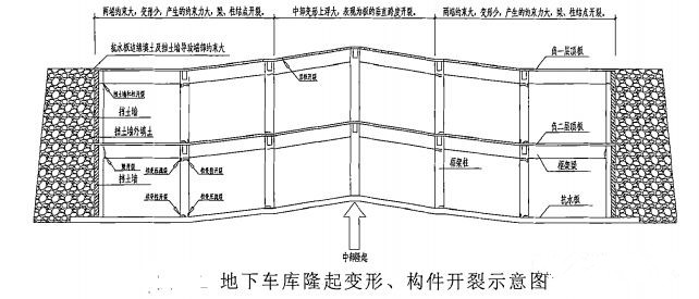 (3)施工期情況:施工期忽視降、排水對(duì)地下室破壞的重要性,施工期間未嚴(yán)格按施工組織設(shè)計(jì)采取降、排水措施并且在抗浮結(jié)構(gòu)未達(dá)到設(shè)計(jì)預(yù)定目標(biāo)時(shí)就停止了降水,再者,明知建筑物未考慮抗浮和防滲措施,地下室完工后不按要求及時(shí)回填,并在雨季施工期間不及時(shí)采取降排水措施,基坑大量積水,導(dǎo)致地下室上浮破壞。