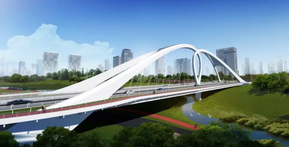 橋梁拱圈造型曲線優(yōu)美,用抽象手法進行現(xiàn)代演繹,梁拱渾然一體,簡潔輕盈,極具現(xiàn)代氣息;橋梁設(shè)計方案靈感來自水滴,拱圈造型創(chuàng)意來源于其優(yōu)美的曲線,用抽象手法進行現(xiàn)代演繹,拱梁渾然一體,簡潔輕盈,極具現(xiàn)代氣息。