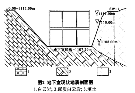 貴州巖溶地區(qū)某建筑物位于斜坡地帶,建筑物長93m,寬36m,地上3層,地下l層(-4.8m架空停車場),局部地下室,地下室長38.8m,寬36m,獨立柱基礎(chǔ),單柱最大荷重3800kN,地基持力層為中風(fēng)化泥質(zhì)白云巖,Ⅱ類建筑場地。后設(shè)計改地下室為地下設(shè)備試驗室,設(shè)計地坪標(biāo)高1112.000m,地下室底板標(biāo)高為1107.200m,框架結(jié)構(gòu)。該工程于2009年12月完成巖土工程勘察,2011年3月開始基礎(chǔ)施工和基坑開挖,在2011年6月4~8連續(xù)強降雨,大量的地表水漫流灌入地下室場地內(nèi),基坑大量積水,造成地下室底板上浮,導(dǎo)致局部結(jié)構(gòu)梁拉裂,11軸交G軸上浮高達68mm,16~17軸交G軸上浮高達48mm,15~16交B~C軸因為電梯井未上浮(見圖1)。此時該工程才完成地基基礎(chǔ)施工和地下室頂板(1層樓面)施工,基坑還未回填。